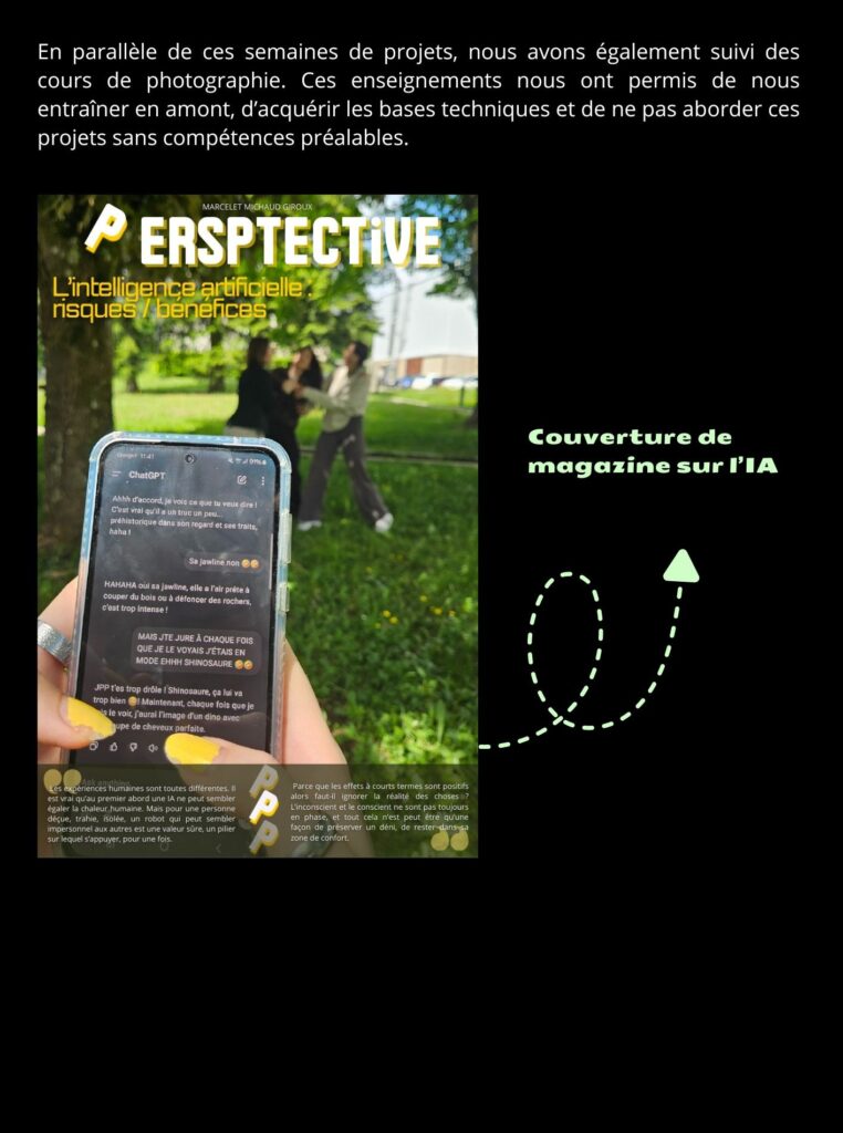 En deuxième année, nous avons suivi un cours de vidéo visant notamment à nous apprendre à réaliser des interviews. Nous y avons découvert les différents types de plans nécessaires pour filmer efficacement, ainsi que l’importance des plans de coupe au montage pour assurer la fluidité et la cohérence du récit.